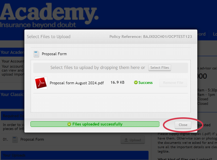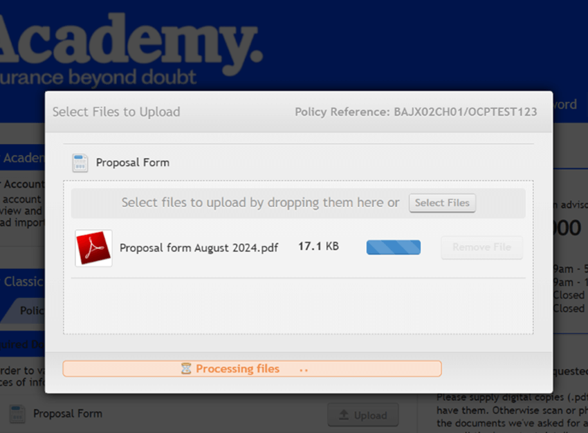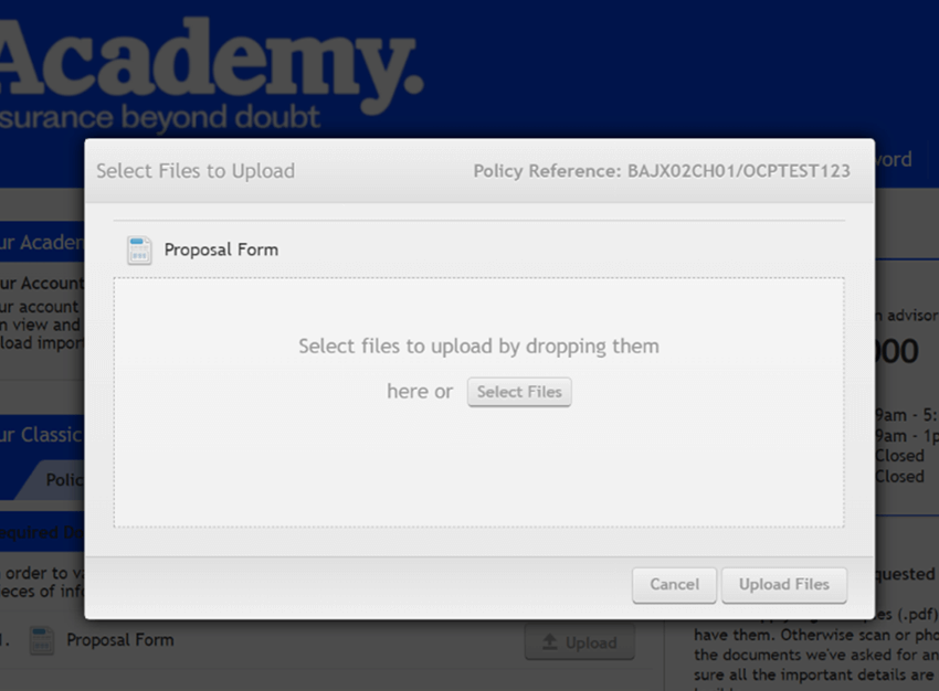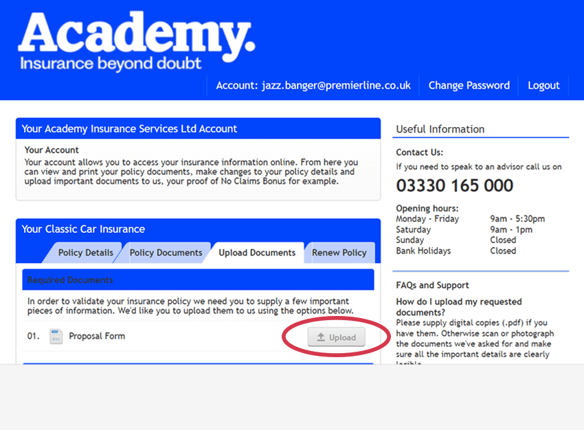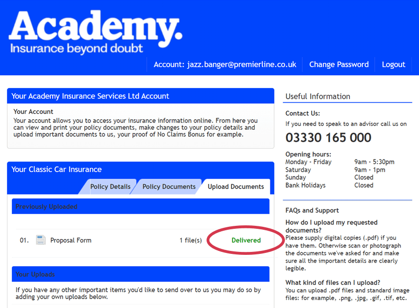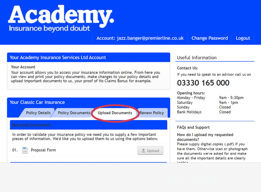 The Academy customer portal allows you to securely upload documents that we have requested or that you wish to share with us. For example, this could be a copy of your driving licence or proof of no claims bonus. You can upload documents as pdf or image files, or clear photographs in standard image formats (png, jpg, or tif), up to a maximum of 4mb per file. Just make sure the information in the file is legible.