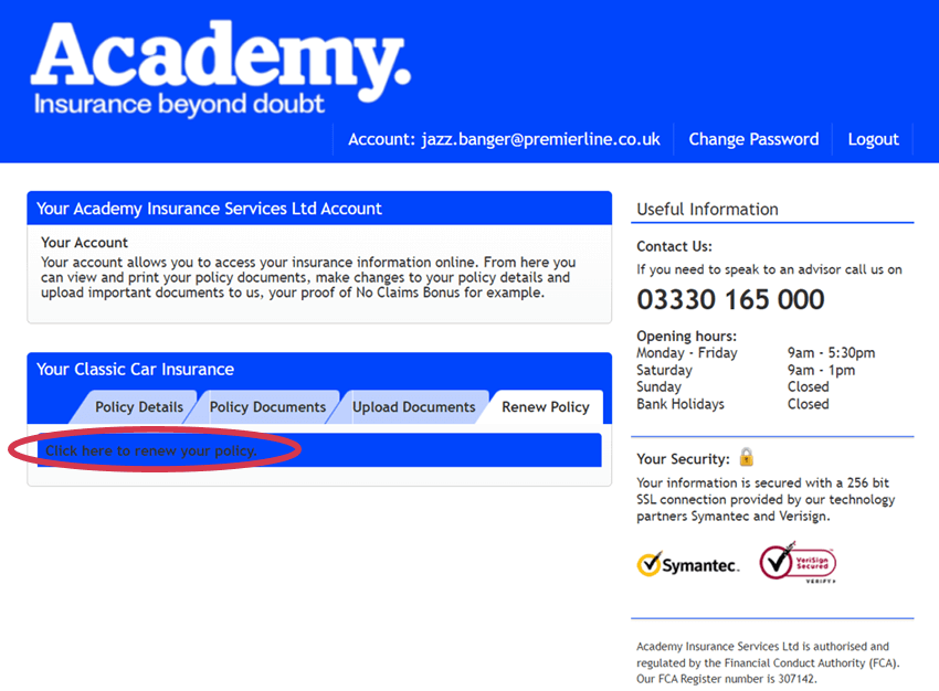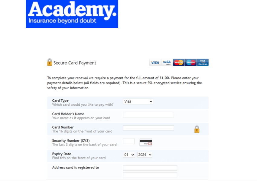 The Academy customer portal may allow you to renew your policy online using the same payment method you used last year.